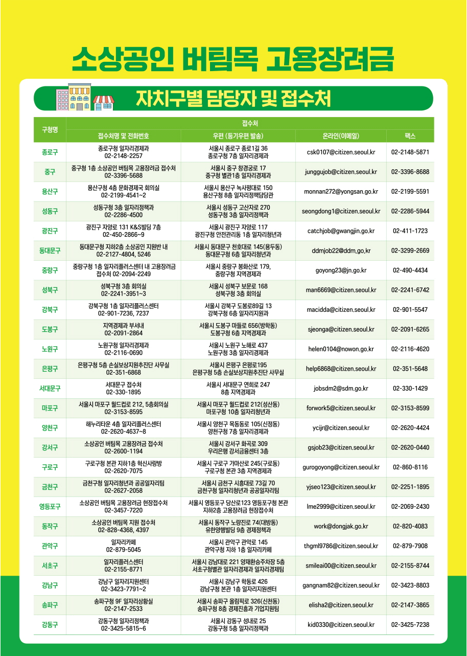 서울특별시에서 소상공인 버팀목 고용장려금 지원합니다. 기업체 소재 자치구별 접수처를 모르시는 분들이 많아 아래 표를 참고하여 안내해 드리겠습니다. 신청인원이 많아 조기 마감될 수 있으니, 자치구별 바로가기 링크로 접속하시면 빠르게 신청하실 수 있습니다.